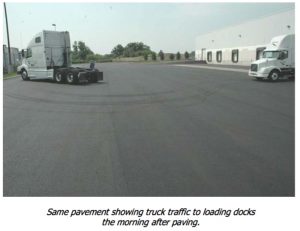 Same pavement showing truck traffic to loading docks the morning after paving.